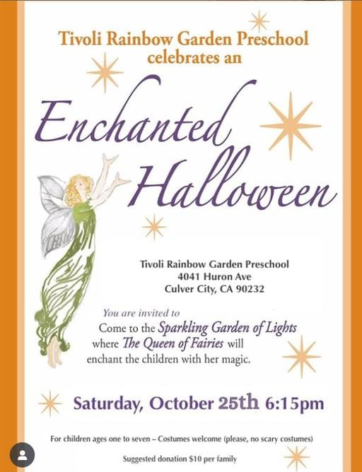 Enchanted Halloween at Tivoli Rainbow Garden Preschool (Oct 25, 6:15pm, ages 1-7) A gentle, fairy-lit experience for sensitive or younger trick-or-treaters—no scary costumes allowed!